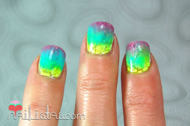 Creo que me estoy aficcionando a los degradados. ¡Una vez les cogí el truco ya no hay quien me pare! Uno de los últimos diseños de la semana es este degradado sobre craquelado. Bueno, en realidad hice dos porque el primero no me gustó nada, sobretodo porque no se ve el craquelado debajo (es el amarillo, azul y violeta). Para ello me di cuenta de que era necesario utilizar esmaltes tipo neón o que cubran poco y así se puedan ver las vetas debajo.